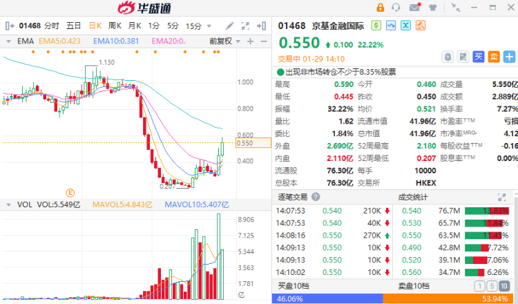 1月29日讯,港股京基金融国际(01468)一度涨超31%,该股上个交易日收涨逾50%。截至发稿,涨22.22%,报0.55港元,成交额2.89亿港元。