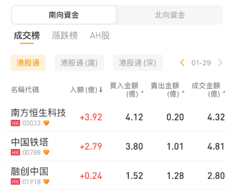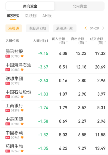 其中,南向资金净买入南方恒生科技3.92亿港元、中国铁塔2.79亿港元;净卖出腾讯控股9.15亿港元、中国海洋石油3.67亿港元。