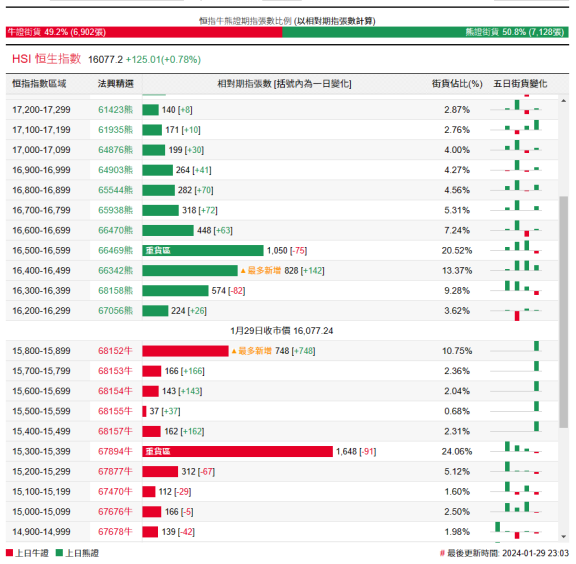 街货分布方面,至周一,恒指牛证街货重货区间主要在收回价15300点至15900点之间,累计相当约2904张期指合约;恒指熊证街货重货区主要在收回价16200点至16800点,累计相当约3442张期指合约。