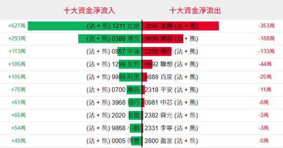 淡仓(认沽证及熊证)方面,周一比迪淡仓单日获527万港元资金净流入,其他相关淡仓资金流规模均较小。