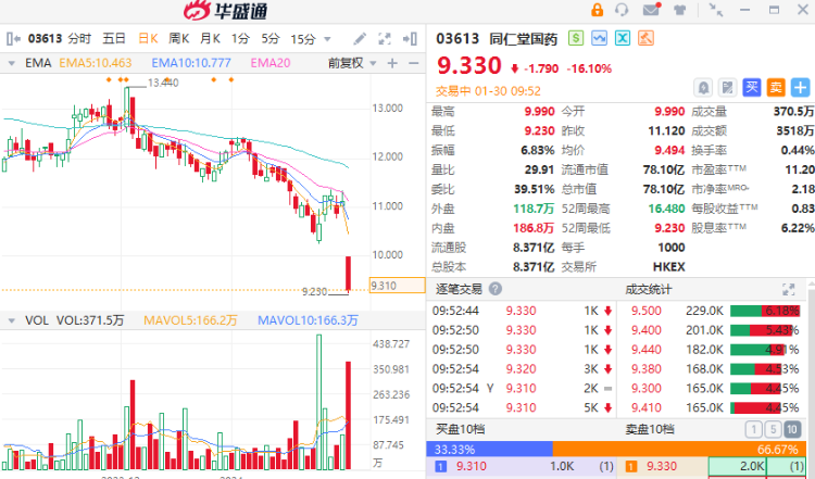 1月30日讯,港股同仁堂国药(03613)跌超16%,截止发稿报9.33港元,成交额3518万港元。