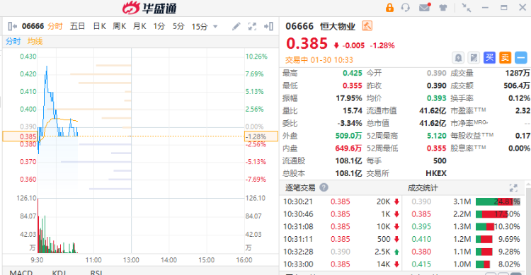 恒大物业平开,盘中下探后,快速反弹,一度涨逾8%,目前跌1.28%,振幅近18%。