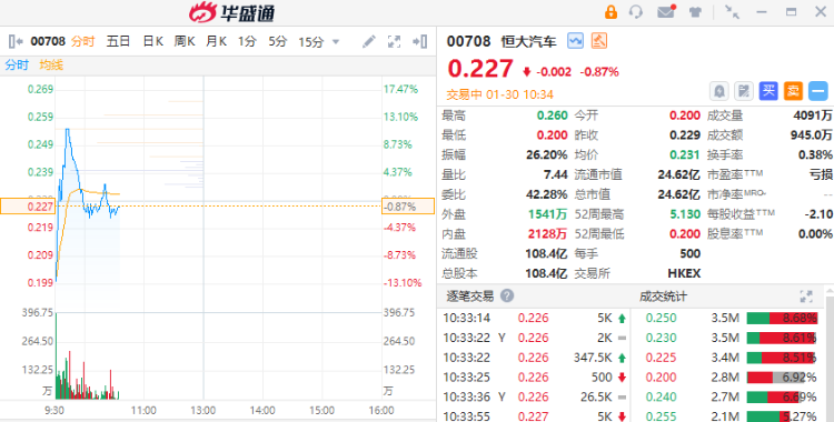 1月30日,港股恒大汽车、恒大物业复牌,股价大幅波动。恒大汽车以逾12%跌幅开盘,盘中快速拉升,一度涨逾11%,目前股价再次回落,跌0.87%,振幅超26%。