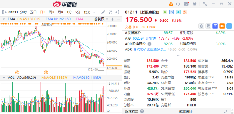 若算上今日的表现,比亚迪股份H股已连续五日下跌,其累计跌幅超10%。