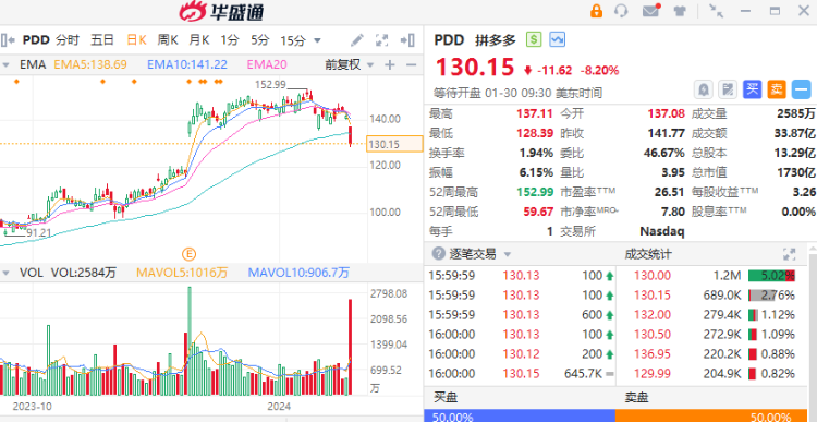 1月30日周一,拼多多股价下跌 8.2%,报130.15美元,股价跌破50日移动平均线。