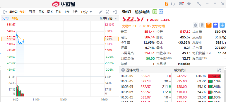 AI“新贵”超微电脑 $SMCI 盘初冲高现涨超5%,超微电脑第二财季营收为36.6亿美元,同比翻倍。