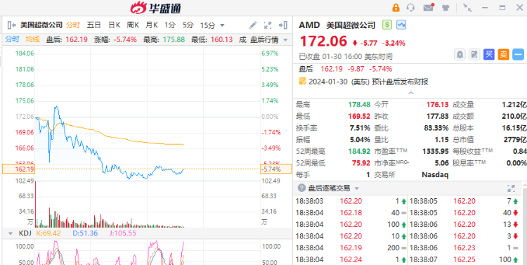 AMD公布的最新业绩指引低于市场预期,其股价在盘后跌超5%,报162.19美元。