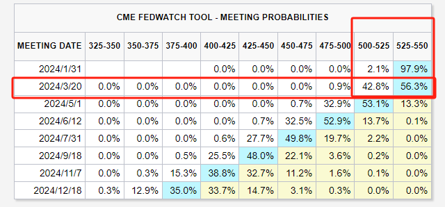 高盛在一段时间以来一直预测3月份是最有可能的降息时机,现在仍预测3月为美联储加息周期后的首次降息时机。CME“美联储观察工具”显示,利率期货交易员继续认为,美联储5月份首次降息的可能性最大,而不是上周四超预期强劲的美国GDP数据公布前利率市场普遍押注的3月降息。