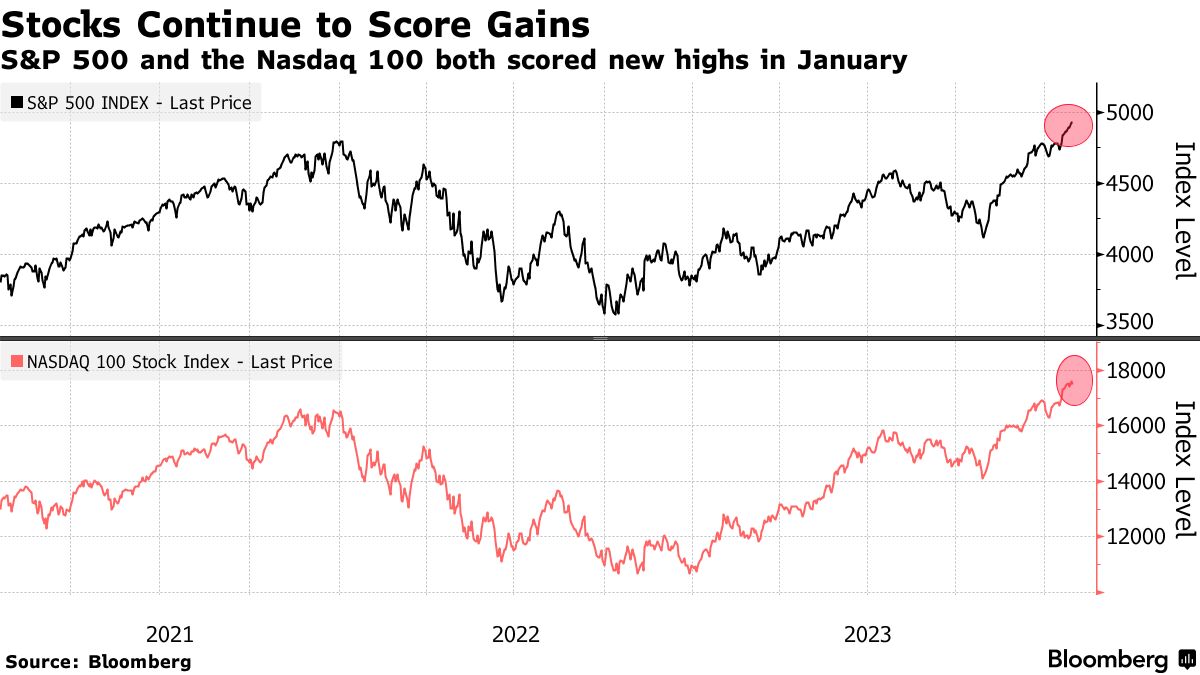 标普500指数和纳斯达克100指数都在一月创下历史新高