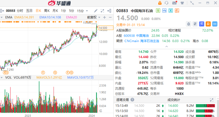 地缘局势紧张,英美期油升近1%或以上,中国海洋石油今早曾逆市上升近1%,触14.74港元,并升穿多条平均线。
