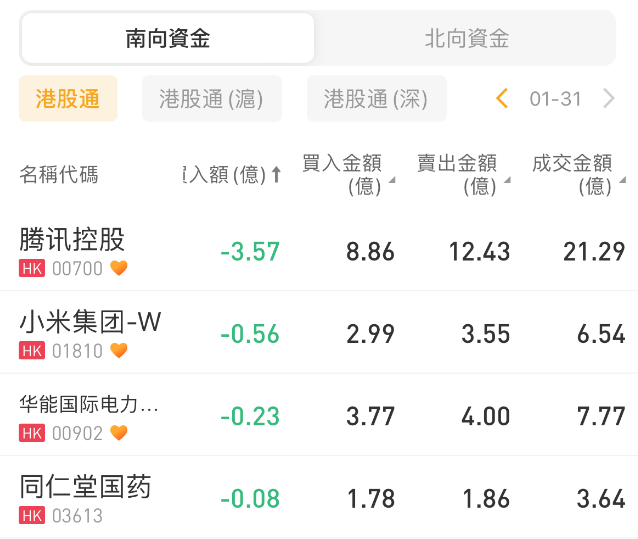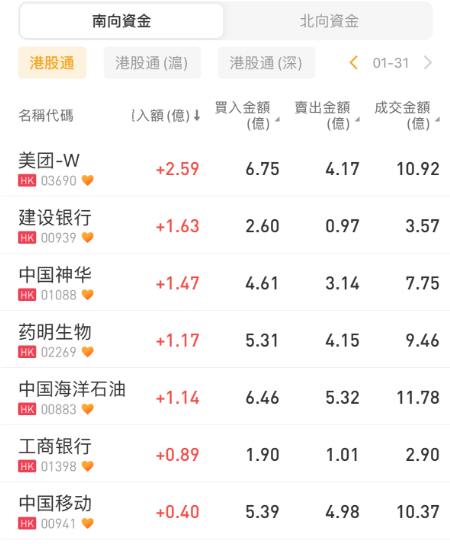 其中,南向资金净买入美团-W2.59亿港元、建设银行1.63亿港元;净卖出腾讯控股3.57亿港元。