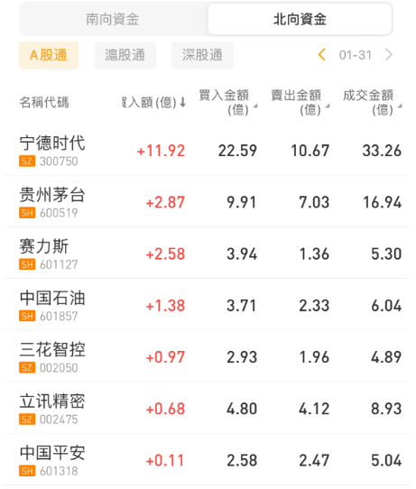 北向资金今日净买入37.01亿元。宁德时代、贵州茅台分别获净买入11.92亿元、2.87亿元。药明康德净卖出额居首,金额为3.26亿元。
