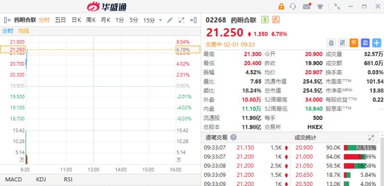 2月1日,药明合联(02268)高开,截至发稿,涨6.78%,报21.25港元,成交额681万港元。