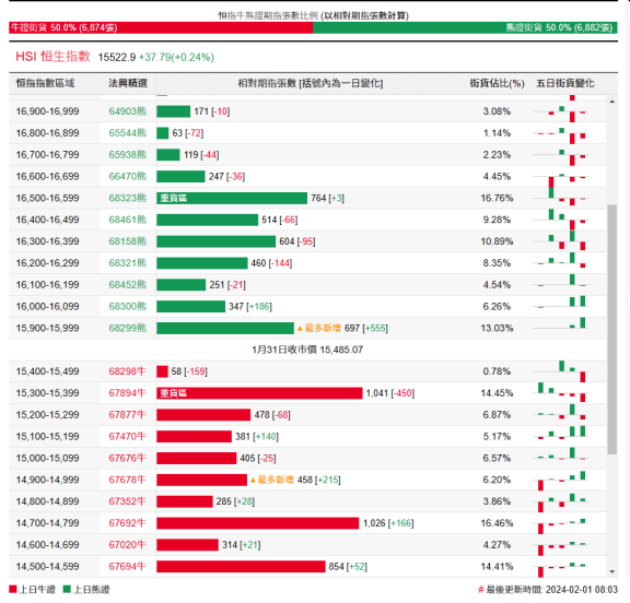 街货分布方面,至周三,恒指牛证街货重货区间主要在收回价14900点至15500点之间,累计相当约2821张期指合约;恒指熊证街货重货区主要在收回价15900点至16600点,累计相当约3637张期指合约。