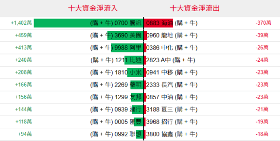 周三港股获南下资金净卖出6.32亿港元,美团、建银分别获净买入2.59亿港元、1.63亿港元;腾讯控股遭净卖出3.57亿港元。