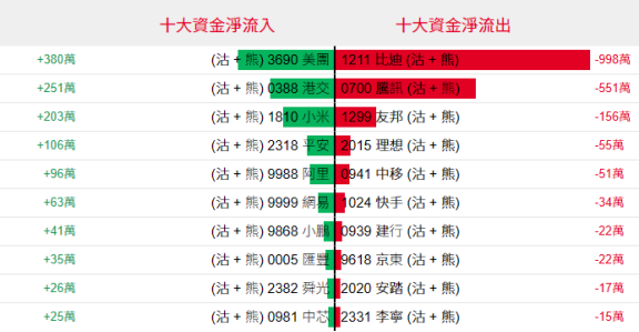 淡仓(认沽证及熊证)方面,周三比迪、腾讯淡仓单日分别获998万港元、551万港元资金净流出,其他相关淡仓资金流规模均较小。