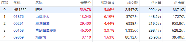 2月1日,港股啤酒股早盘涨幅居前,截至发稿,百威亚太涨超6%,华润啤酒涨超4%,青岛啤酒股份涨超3%,海伦司涨近2%。