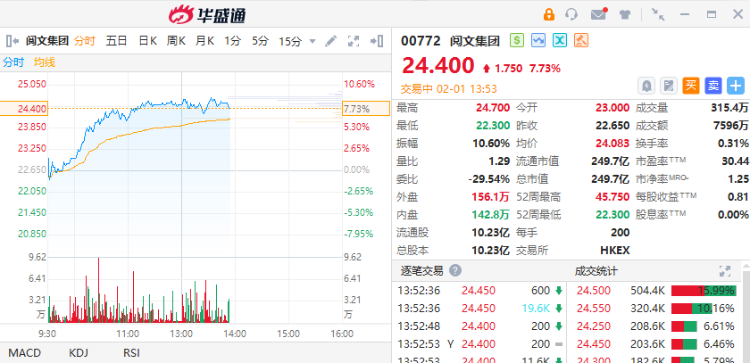 2月1日,阅文集团(00772)股价走强,截至发稿,涨7.73%,报24.4港元,成交额7596万港元。
