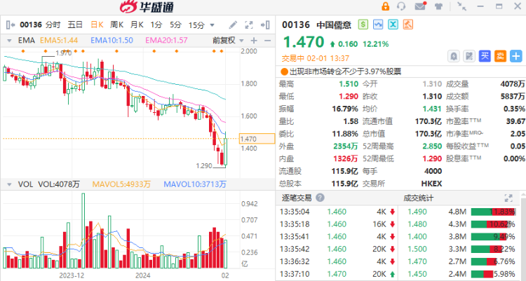 2月1日讯,港股中国儒意(00136)午后涨幅持续扩大,上涨12.21%,现报1.47港元,成交额5837万港元。