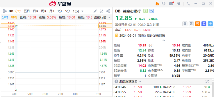 德意志银行 $DB 盘前涨超5%。德意志银行2023年第四季度业绩,净营收为66.58亿欧元,同比增长5%;Non-GAAP归属于股东的净利润为12.6亿欧元,好于分析师预期的约7亿欧元,已连续14个季度实现盈利。德银计划于2024年将股票回购规模和股息均上调50%,拟于今年上半年进一步回购6.75亿欧元的股份,拟派2023年年度股息每股0.45欧元,高于2022年的每股0.30欧元。
