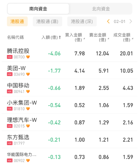 其中,南向资金净买入中国海洋石油1.99亿港元、中国神华1.80亿港元;净卖出腾讯控股4.06亿港元。