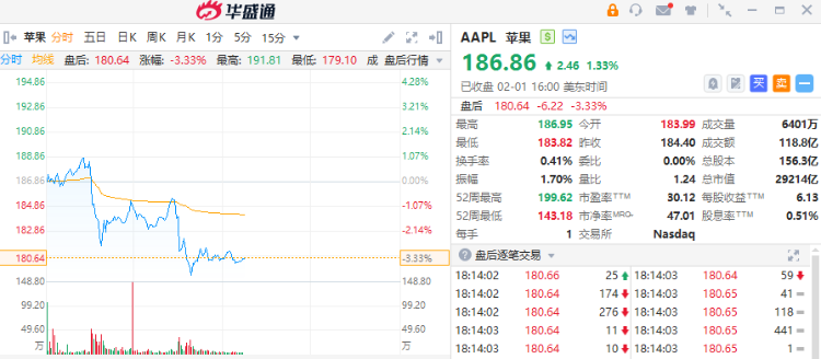 当日,苹果公司股价在纳斯达克常规交易中上涨2.46美元,报收于186.86美元,涨幅为1.33%。