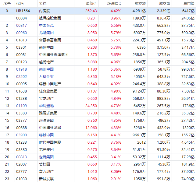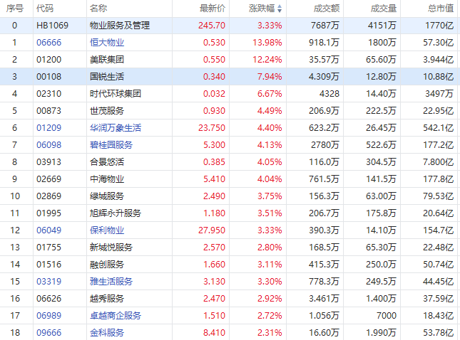 物管股方面,恒大物业涨近14%,两日暴力反弹逾32%;世茂服务、华润万象生活、碧桂园服务涨超4%,绿城服务、旭辉永升服务、保利物业、融创服务等涨超3%。