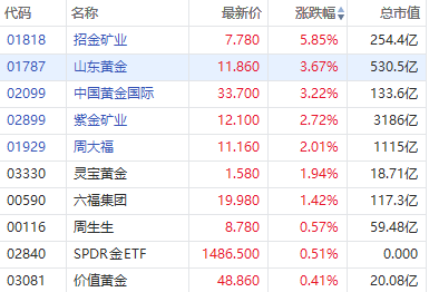 2月2日,黄金股早盘普涨,截至发稿,招金矿业涨超5%,山东黄金、中国黄金国际涨超3%,黄金矿业、周大福涨超2%,灵宝黄金涨超1%。