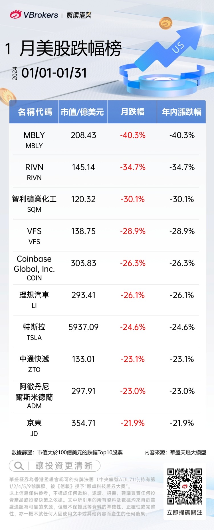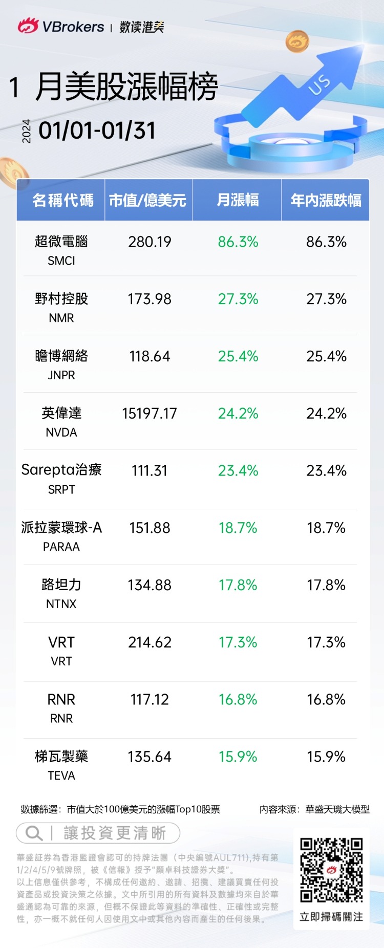發仔统计了每月美股涨跌幅Top10,具体名单如下: