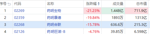 药明康德(02359.HK)跌19.84%,创逾四年低,成交1,527.58万股,涉资7.77亿元。