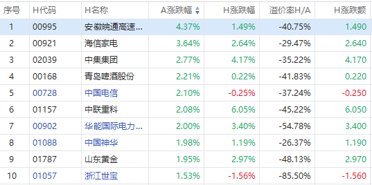 截至发稿,海信家电A股涨3.64%,H股涨2.64%;中集集团A股涨2.77%,H股涨4.17%;中联重科A股涨2.08%,H股涨6.05%。