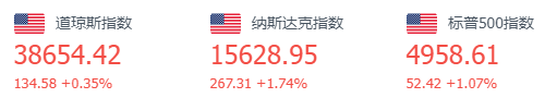 美股上周五三大股指全线收涨,道指涨0.35%报38654.42点,标普500指数涨1.07%报4958.61点,均创历史收盘新高,纳指涨1.74%报15628.95点。全周,道指涨1.43%,标普500指数涨1.38%,纳指涨1.12%。科技股方面,财报后,Meta飙涨20%、创历史新高,亚马逊涨近8%,苹果盘初跌超4%后一度转涨。英伟达涨近5%,全周第四日收创历史新高;AMD涨超4%,扭转财报周跌势。财报周谷歌跌超6%,收创历史新高的微软涨近2%。