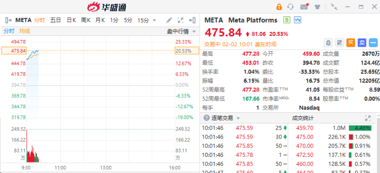 明星科技股走势分化,Meta涨超20%,亚马逊涨近7%,英伟达涨超3%,微软涨超1%,特斯拉、苹果跌约2%,谷歌跌超1%。