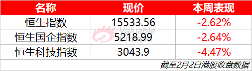 本周三大指数全线下挫,恒科指跌超4%,报3043.9点;恒指周跌2.62%,报15533.56点;