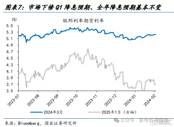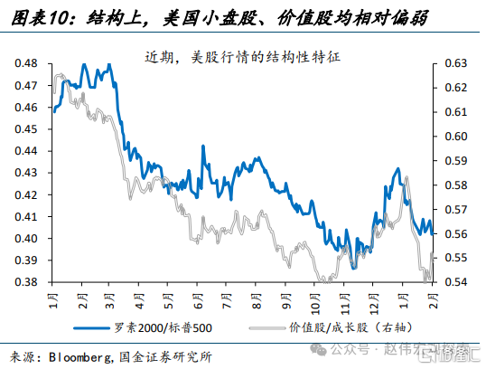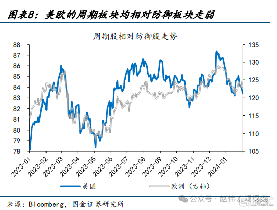 经济韧性通常是“股债跷跷板”回归的解释之一,但市场的结构性表现上却并未体现。从基本面角度来看,美国1月PMI、四季度GDP均超市场预期,花旗经济意外指数,美国与欧洲也分别由1.1和-40.5上行至30.7和4.4;韧性的经济表现,导致市场对3月降息的预期进行了下修、由12月底的84.3%降至2月2日的22.2%。但市场交易端,对经济韧性似乎并未有过多反应:一方面,联邦利率期货隐含的全年降息次数仅由6.9次降至6.5次,另一方面,美国与欧洲周期板块均相对跑输防御板块。经济韧性或已不是本月的交易主线。