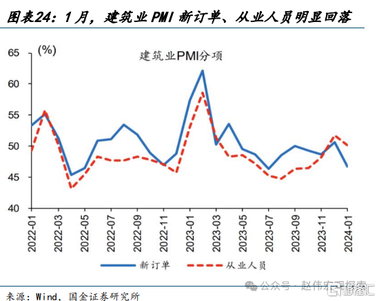 直至1月下旬,降准的超预期落地一度明显提振市场情绪,但随后PMI数据透露的需求不强、“稳增长”落地放缓,使市场情绪再度回落。1月24日,央行超预期降准0.5个百分点、释放超万亿长期资金。降准落地后,市场情绪短期得到提振,我们计算的A股情绪指数一度达到24.3、达12月以来新高。然而,经济需求未明显提振、建筑业PMI新订单回落等掣肘下,市场预期再度转弱,A股情绪指数走弱至月底的18.4、A股也随之再度调整。