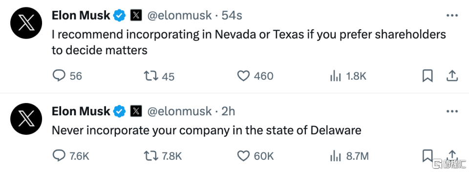 对此,马斯克随后便回应称:切勿在特拉华州注册公司,并建议在内华达州或德克萨斯州进行注册。