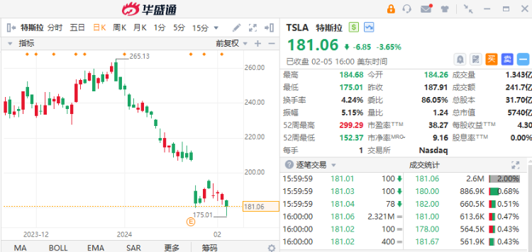 周一,特斯拉股价再度重挫,盘中一度跌近7%,收跌3.65%报181.06美元,创下八个月来的新低。最新总市值为5755.76亿美元,市值一夜蒸发超218亿美元(约1600亿元人民币)。