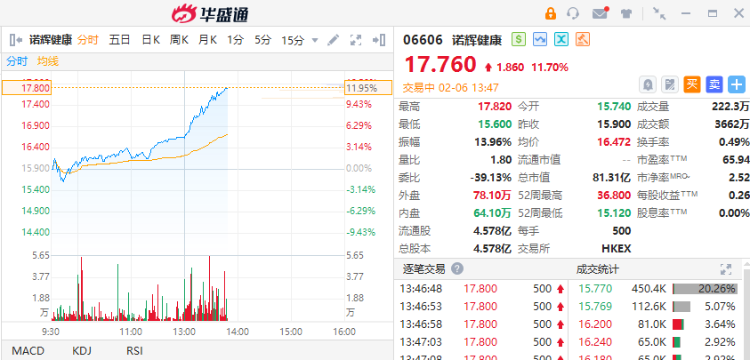2月6日,诺辉健康(06606)涨超11%,截至发稿,涨11.7%,报17.76港元,成交额3662万港元。