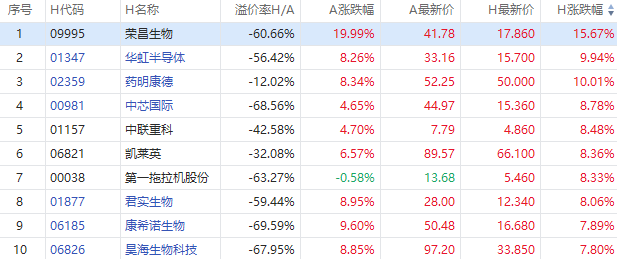 截至发稿,荣昌生物A股涨停,H股涨15.67%;华虹半导体A股涨8.26%,H股涨9.94%;药明康德A股涨8.34%,H股涨10.01%。
