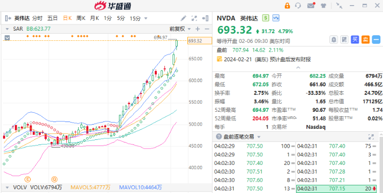 英伟达 $NVDA 美股盘前涨超2%,股价突破700美元/股,超微电脑 $SMCI 盘前涨超3%,现报686美元/股,两家公司开盘或续创历史新高。