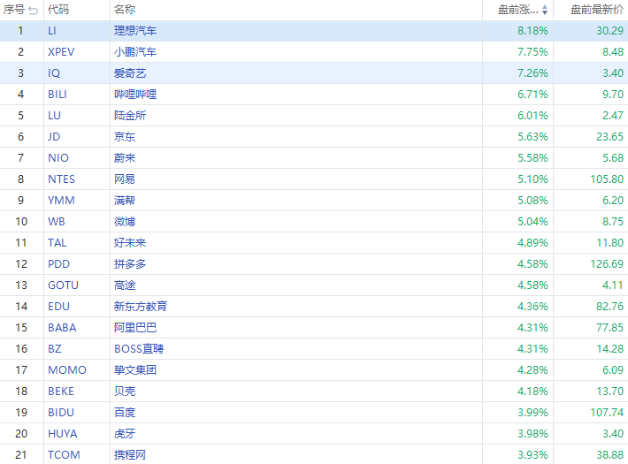 热门中概股盘前爆发,理想汽车涨超8%,小鹏汽车、爱奇艺涨超7%,哔哩哔哩涨超6%,京东、蔚来、网易涨超5%,拼多多、阿里涨超4%。ETF方面,3倍做多富时中国ETF $YINN 盘前涨超12%。