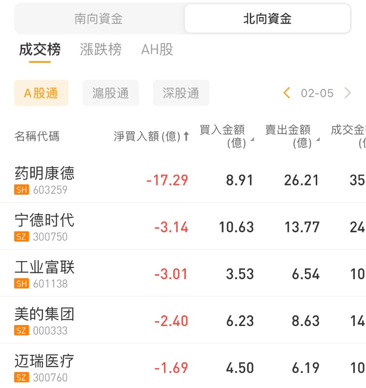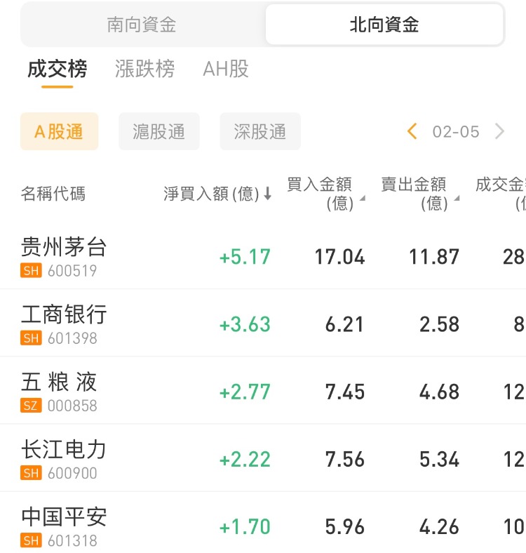 北向资金今日大幅净买入126.05亿元。贵州茅台、五粮液、招商银行分别净买入9.44亿元、4.52亿元、2.70亿元。万华化学净卖出额居首,金额为6.31亿元。