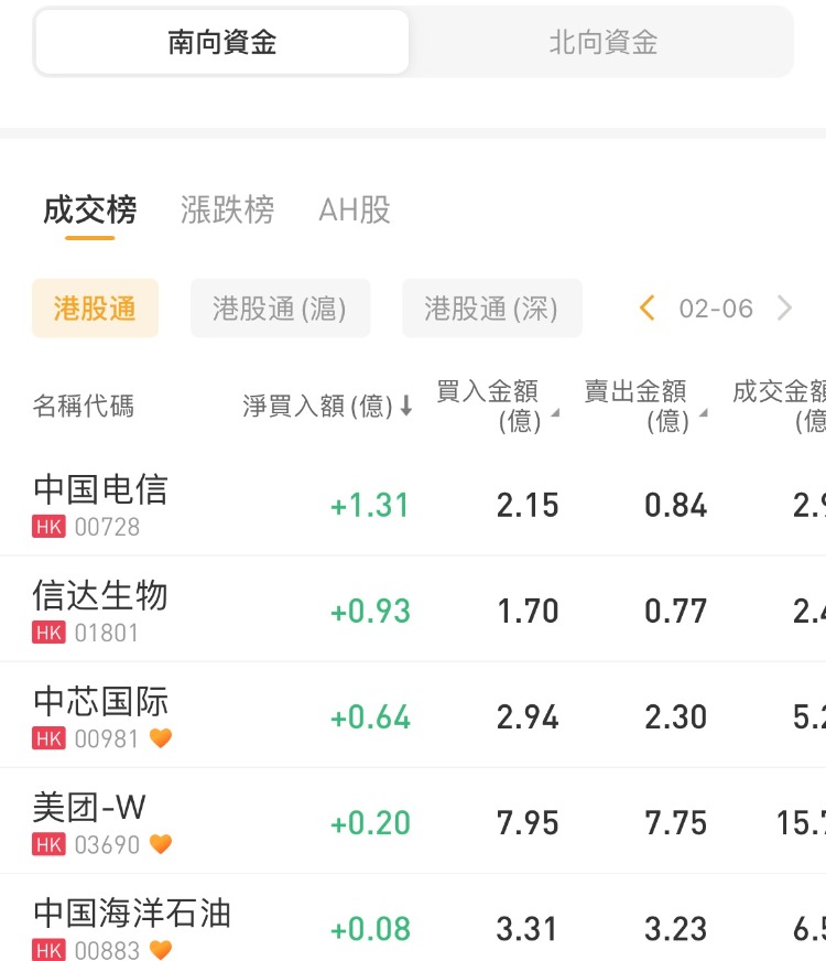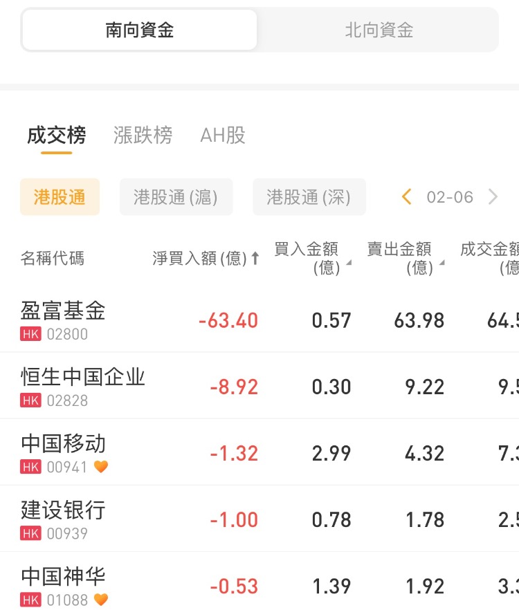 其中,南向资金净买入中国电信1.31亿港元、信达生物0.93亿港元、中芯国际0.64亿港元;净卖出盈富基金63.4亿港元、中国移动1.32亿港元。