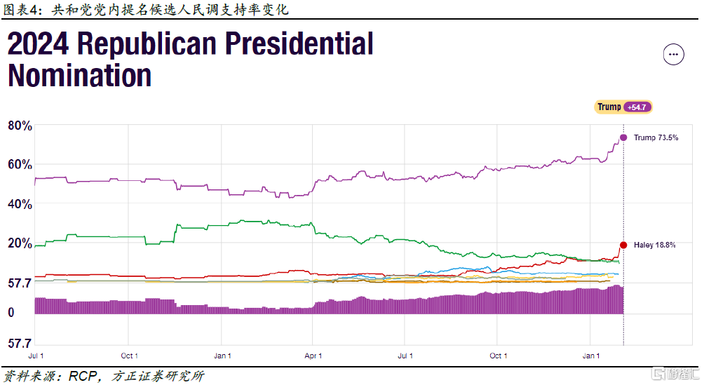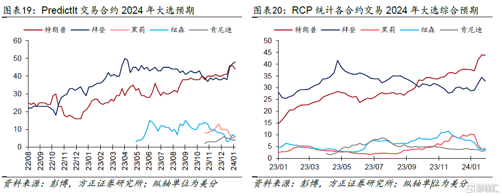 共和党方面,特朗普在今年1月15日的爱荷华州第一场党内初选中以51%得票率的明显优势超越第二名德桑蒂斯(21.2%)和第三名黑莉(19.1%),随后德桑蒂斯宣布退出总统竞选并改为支持特朗普(图表4绿色折线所示的德桑蒂斯在共和党内的支持率于2024年1月不再更新)。在1月23日的新罕布什尔州党内初选中,特朗普又以54.3%的得票率击败了黑莉(43.2%),奠定了自己在党内的明显优势。
