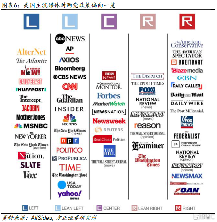 虽然现存的总统大选民意调查数量繁多,但并没有哪一家机构的调查能够脱颖而出。相反,部分调查机构还可能会因为其自身的政治倾向而潜在地影响调查结果。根据AllSides的媒体倾向调查(图表6),美国主流媒体中,CNN、New York Times等在新闻报道倾向上会更偏向民主党,而FOX NEWS则会更偏向于共和党。而一些知名学术机构和咨询公司虽然在立场和调查方法上更加中立科学,但是其本身调查结果的准确度与拟合度也并未明显高于其他民调并成为业内权威。真正能做到立场相对中立、知名度较高、披露数据详实、数据更新及时的机构并不多,其中最具有代表性的是Real Clear Politics。