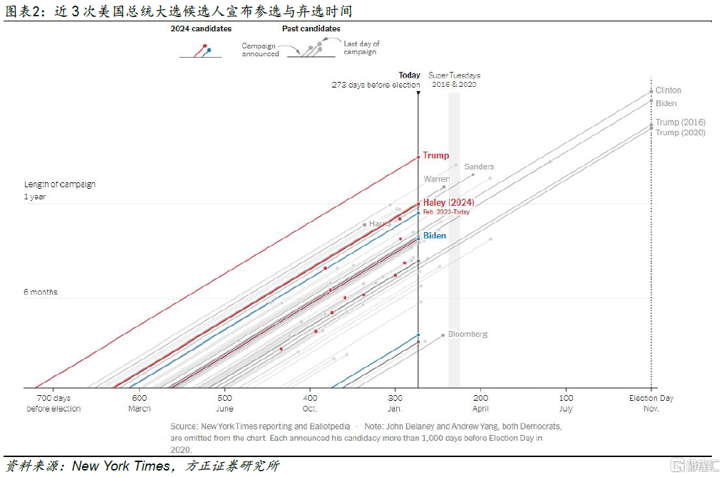 当然,我们认为无需对这9位候选人逐一进行分析。在前篇报告《美国总统大选101:选举制度与基本流程——美国2024年总统大选专题#1》中我们提到,1月15日爱荷华州的共和党党内初选和1月23日新罕布什尔州的民主党党内初选的结果就基本奠定了特朗普和拜登在各自党内的领先地位,“超级星期二”后,2024年大选的两党候选人基本可以被确认。