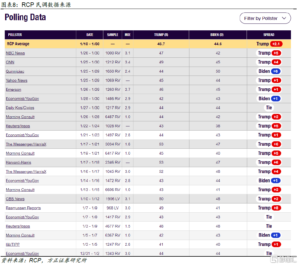 统计方法上,RCP会统计同一时间段内各家民调结果并进行简单平均处理,以得到对应时段的综合民调结果。图表8展示了RCP最新汇总的民调数据来源,除了公布对两位候选人的支持率外,RCP还披露了民调的统计机构、统计时间、样本数量&属性(RV代表注册选民、LV代表潜在选民)、误差范围(Margin of Error)。通过对RCP的综合民调结果的追踪,我们可减少因追踪单个民调而产生的结果误差,以更好地追踪拜登和特朗普在选民中支持率的实时变化情况。
