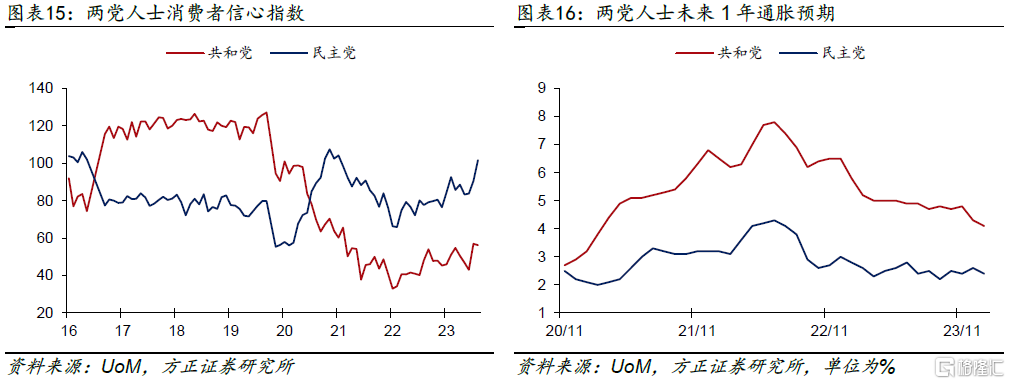 除去RCP的各类综合统计外,美国密歇根大学(UoM)知名的消费者调查问卷也会对两党人士的消费与通胀倾向进行分析。图表15-16显示,民主党人士在2020年8月后普遍具有较高的消费信心,而共和党人士的消费信心则出现回落。同时,自2020年11月起,共和党人士较民主党人士一直具有更高的通胀预期。换言之,拜登执政期间,共和党人在消费与通胀上或有着更差的体验。