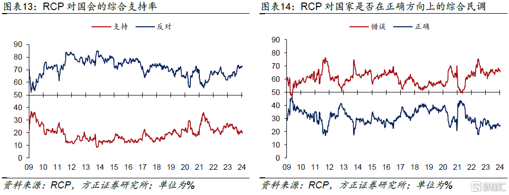 除去传统的对候选人的民调支持率外,RCP还会统计民众对国会的支持率,选民对国家是否在正确方向上的调查反馈。截至最新,民众当前对国会的支持率为20%,略高于19%的历史均值,反对率为73%,略高于71%的历史均值。有65.4%的民众认为美国在错误的方向上前进(历史均值61%),有24.9%的民众认为美国在正确的方向上前进(历史均值31%)。